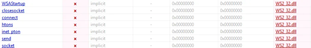 We see in the imports section many suspicious functions like DeleteFileA, WSAStartup, connect, send, and other functions related to network communication, which indicates that the ransomware communicates with C2, maybe. I will see.