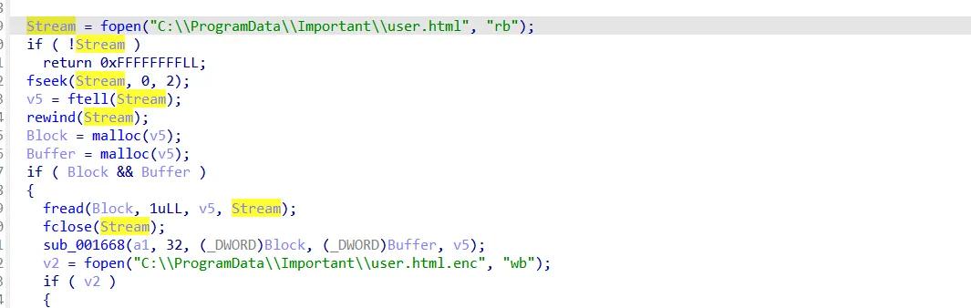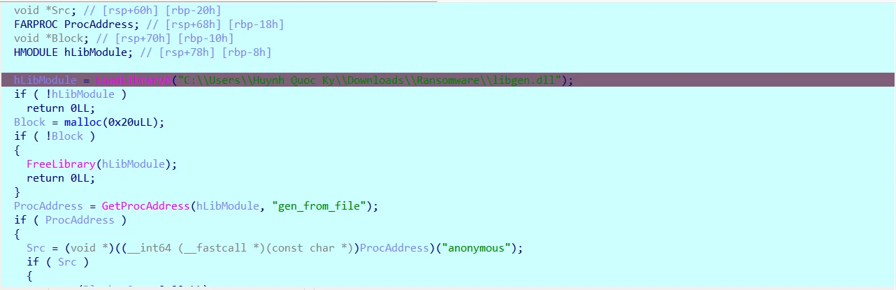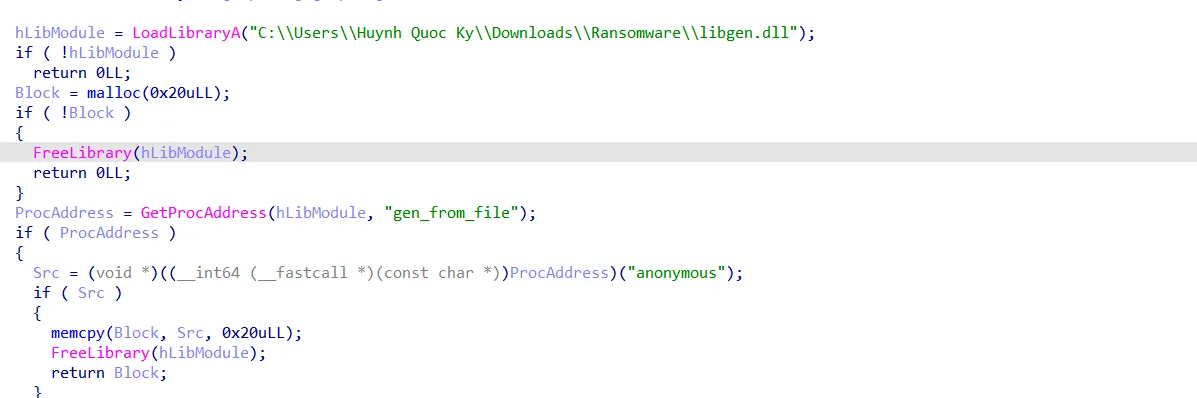 2. The program encrypts an important file called “usr.html” and a DLL named libgen.dll. The DLL is used to retrieve functions that read data from the anonymous file, which is later used during encryption.