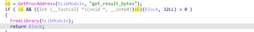 Again same approach, it gets the address of another weird function, get_result_bytes, and calls it with a block argument, then returns that block, so it fills that block with some data, which we still do not know what these data are going to be used for.