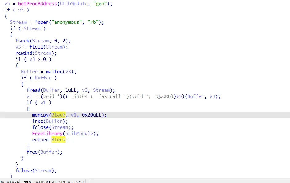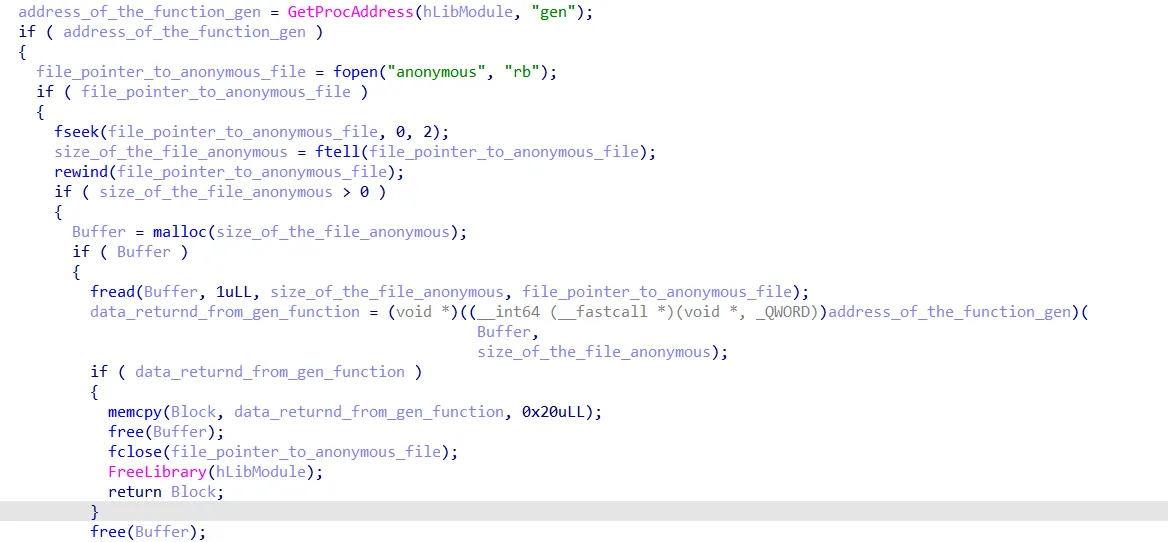 Then the program calls that weird get_from_file function with a parameter called “anonymous”, it then writes the result to the previously initialized block and returns that block.