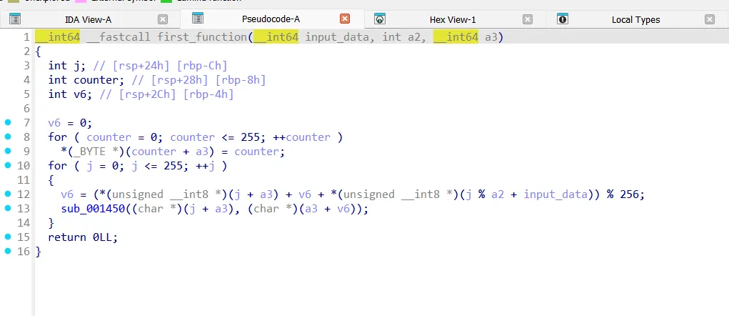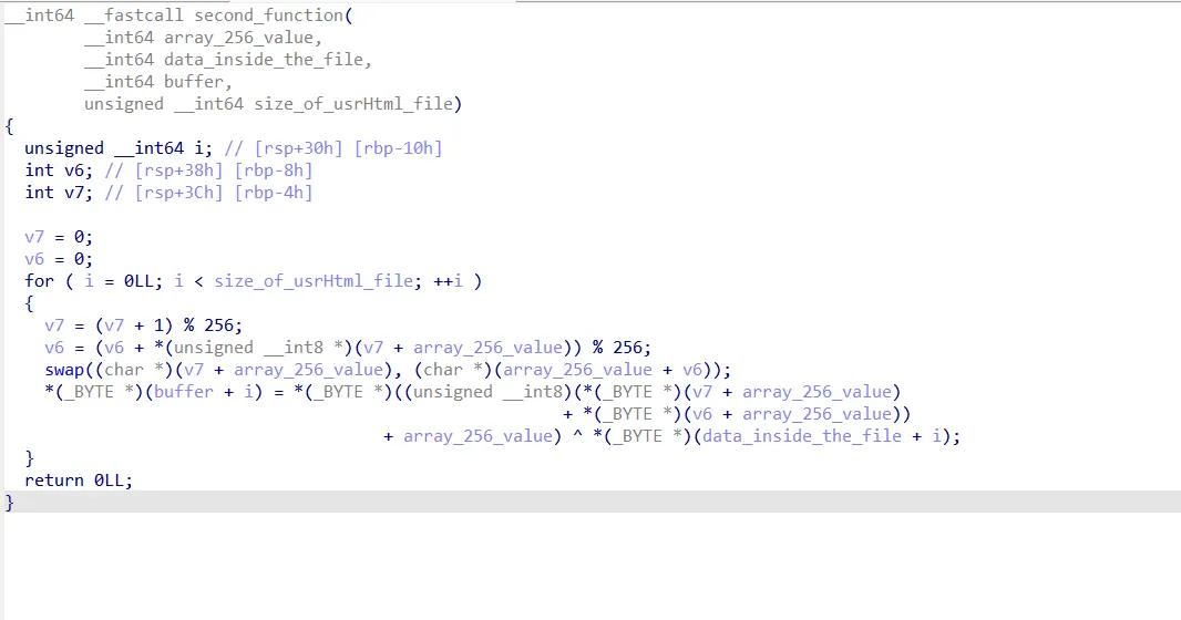 if u are a new to ctfs u may wonder what does this do, but i have seen this function many times before, it is part of the rc4 algorithm, which is used for data encryption/decryption, and btw RC4 is not used now in applications cuz it has many vulnerabilities , another important thing , when i said i saw this form before , i meant that in a high level , like my eye just suspected that i saw it before in rc4 kSA, maybe i am wrong, maybe not …. this is an important concept in RE, we do introduce hypothesis about some part of the program, then we try to test our understanding if it is correct or not ,so we will see.