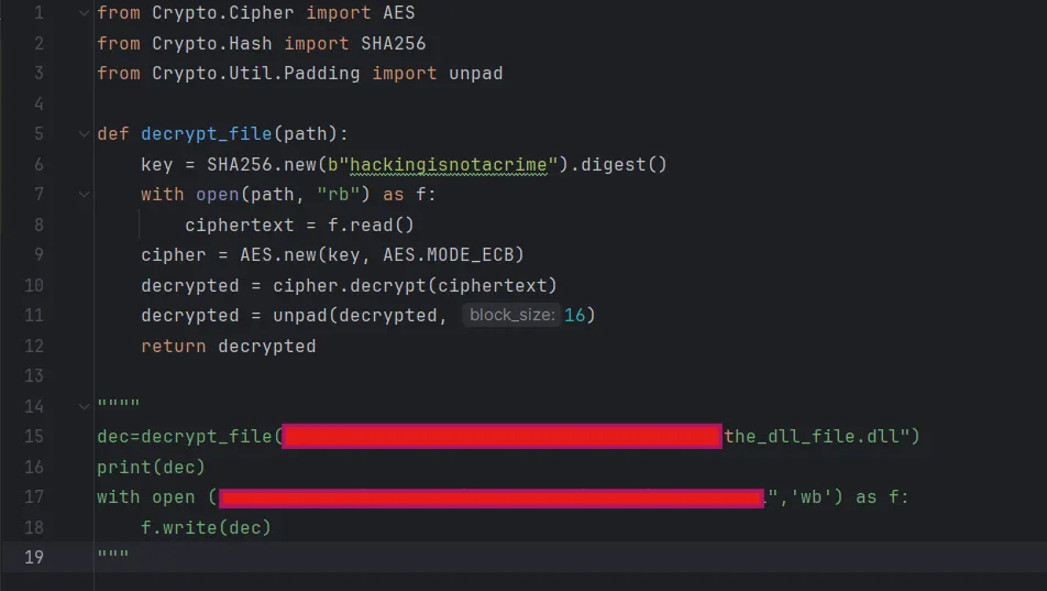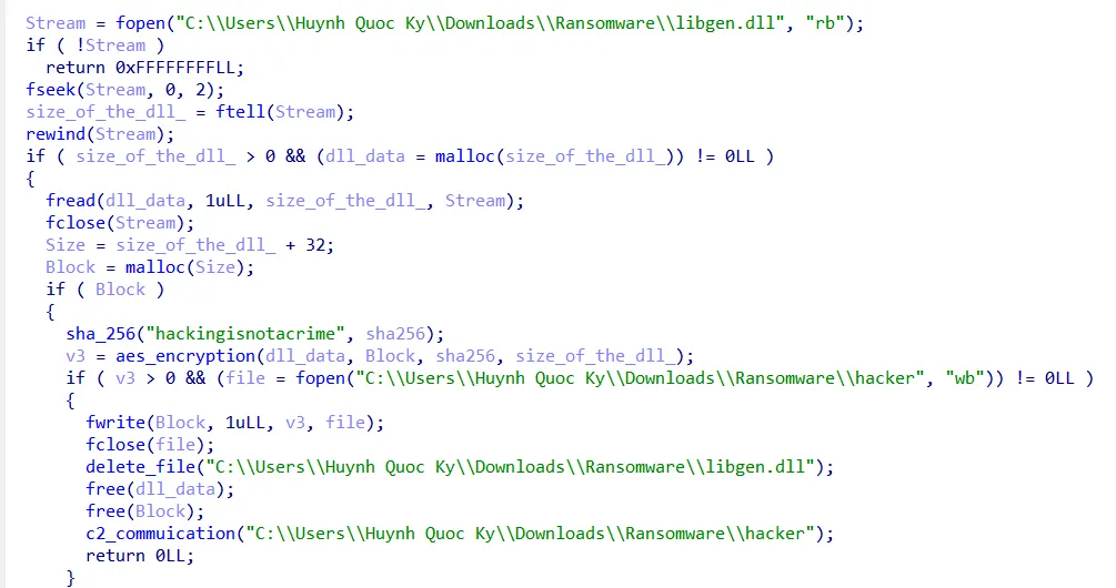 does the same as the previous function, but instead of using RC4, it uses AES with a key (sha256(”hackingisnotcrime”)), and it encrypts the libgen.dll.