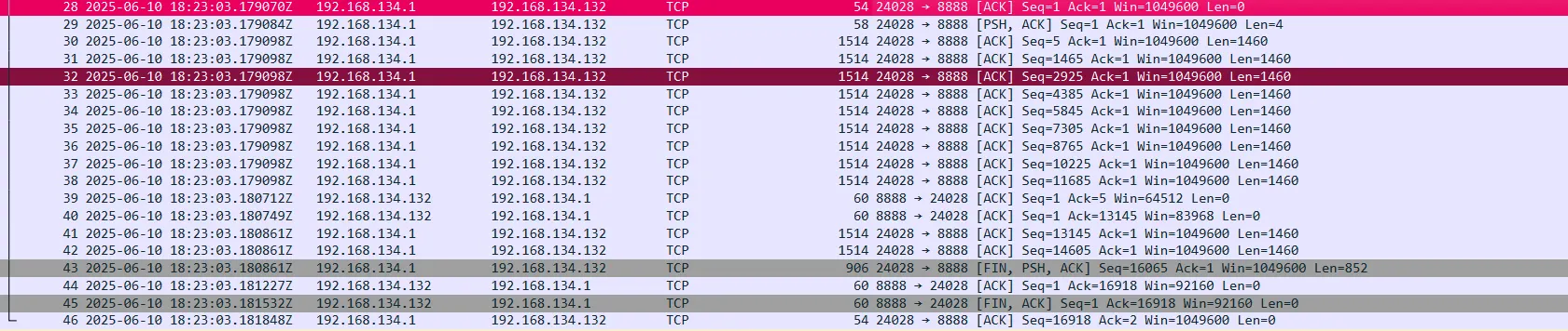 Then, following this packet, we got two packets with data length =2588, representing the user’s HTML file.