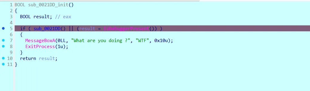 The author implemented a simple anti-debug check that will cause the program to exit, but I will bypass that easily