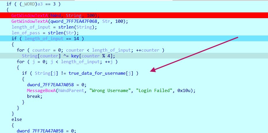 But since we saw text on the window like {“wrong”,“length”,“Username”} and so on, it is probably hard-coded in the program, and if we use the search text feature in IDA, we will spot an important function in IDA, which checks for username and password.