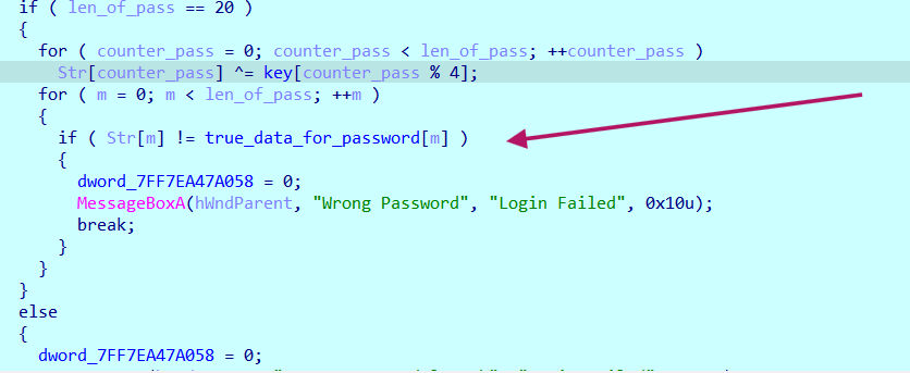The function does simple XOR encryption with our input and compares the result to hard hard-coded expected data