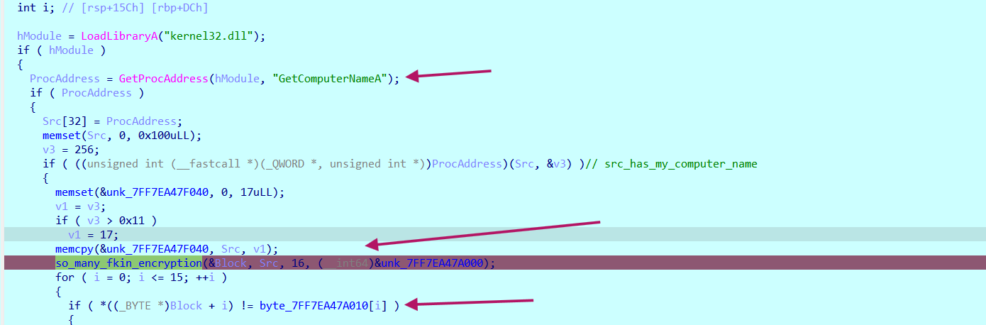 i found this function that get my computer name and inputs it along with a key (0x7ff7ea47a000) to an encryption function, and then compares the result to hardcoded data in 0x7FF7EA47A010
