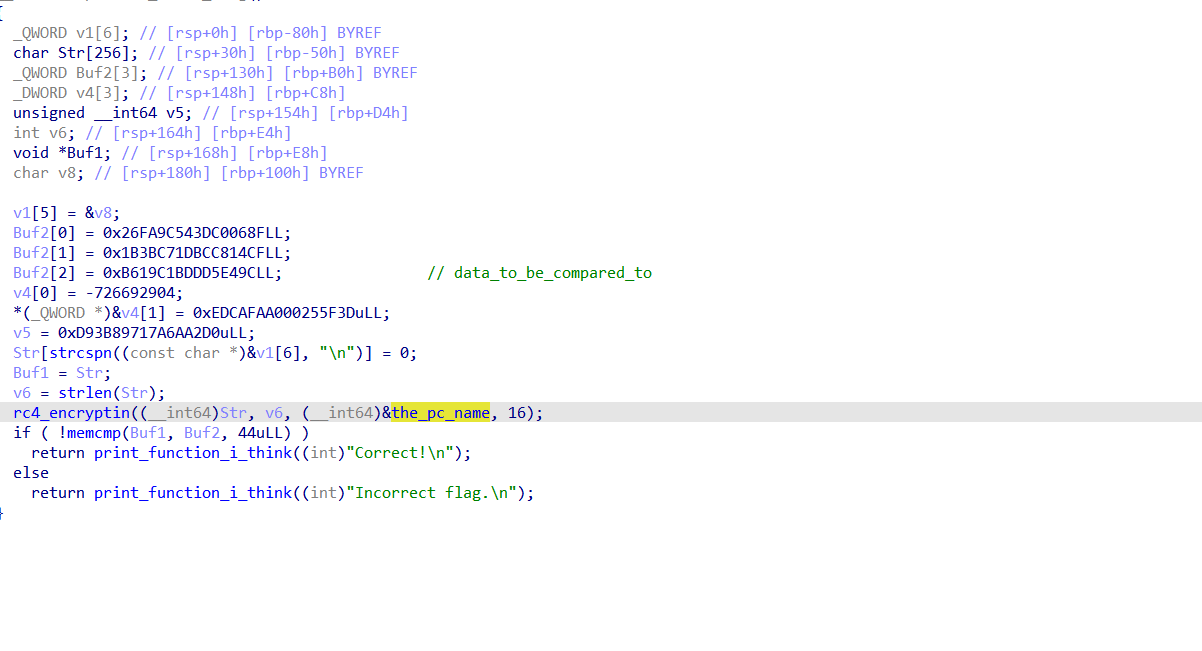 by digging deeper in the program, we found that flag check function it takes the pc name as a key and encrypts bytes, and then compares it to the true data.